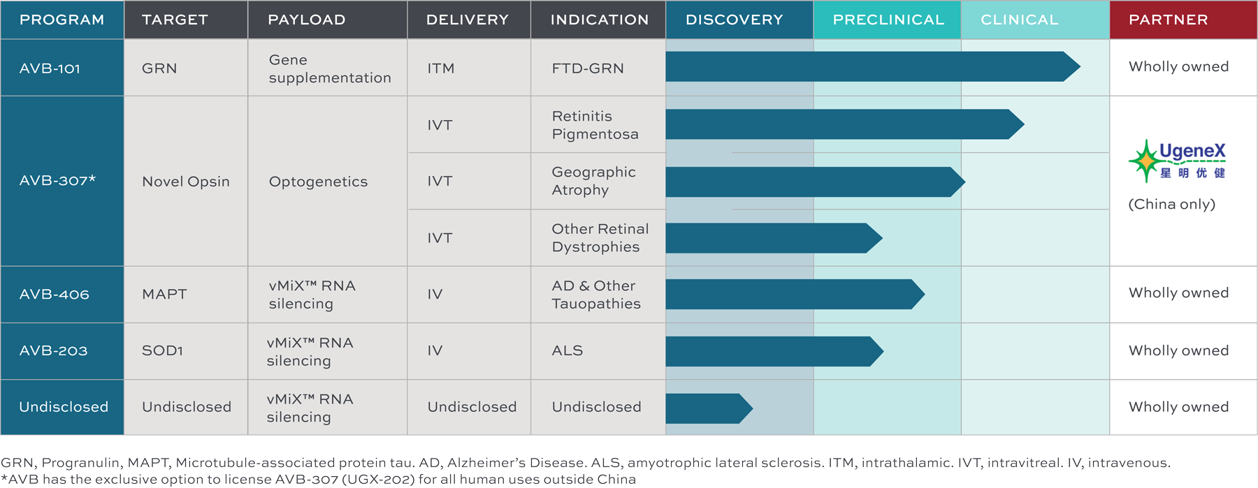 Our proprietary platforms, including intrathalamic and vMiX™ RNA silencing system, plus expertise in intravitreal, and blood-brain barrier (BBB)-penetrant delivery approaches, enable precise, durable therapeutic expression across complex neural systems such as the brain and retina. AviadoBio’s clinical and preclinical pipeline spans frontotemporal dementia (FTD), amyotrophic lateral sclerosis (ALS), inherited retinal diseases, and tauopathies, including Alzheimer’s disease.